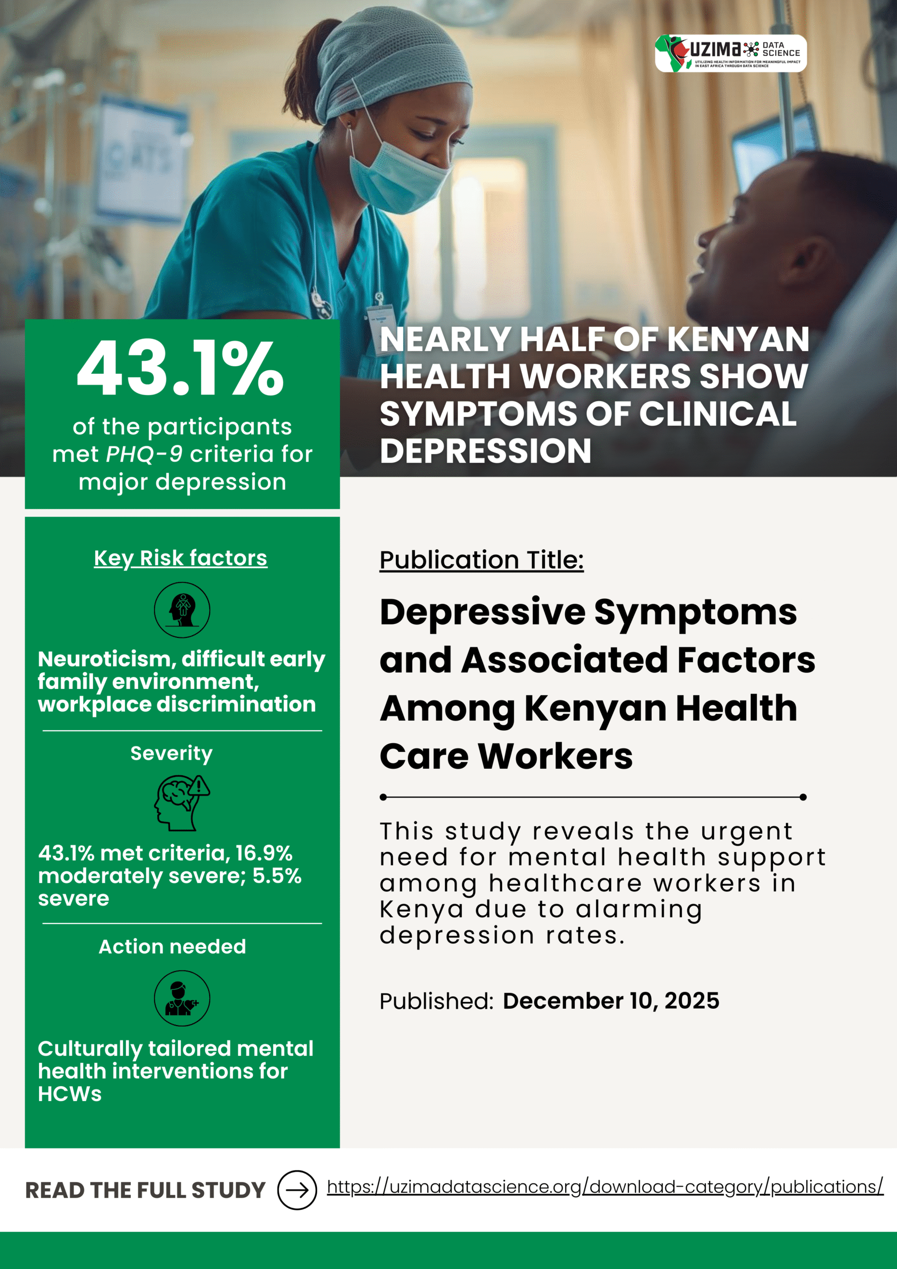 The mental health of health care workers (HCWs) is an important global concern, particularly in low- and middle-income countries (LMICs) such as Kenya, where unique stressors may place HCWs at disproportionate risk for depression.1 However, depression prevalence and risk factors in this population are not well understood. To address this gap, we evaluated the prevalence of depressive symptoms among Kenyan HCWs and identified associated demographic, psychological, and workplace factors.