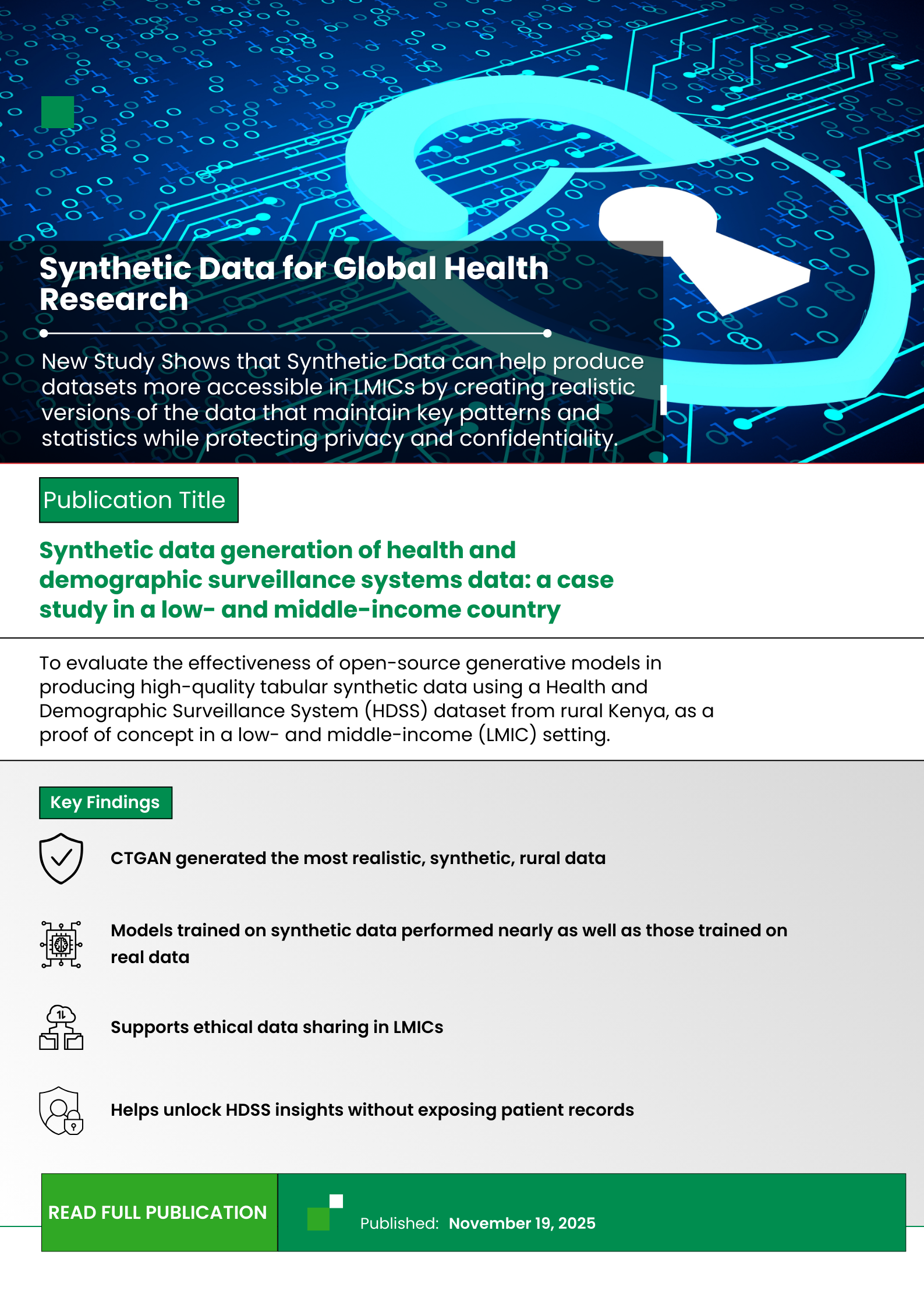 This study explored the effectiveness of open-source generative models in generating realistic, privacy-preserving synthetic datasets of a Health and Demographic Surveillance System (HDSS) dataset obtained from rural Kenya, as a proof of concept for low- and middle-income countries (LMICs). Using 3 open-source models—CTGAN, TableGAN, and CopulaGAN—synthetic data were created from the real data while maintaining important characteristics like missing values and outliers. The quality of the synthetic data was evaluated to determine whether it maintained the statistical properties present in the real data and provided privacy protection. Among the models tested, CTGAN performed the best, producing synthetic data that closely resembled the real data while preserving data privacy. In contrast, CopulaGAN and TableGAN were less successful, with TableGAN completely failing to generate realistic synthetic data. This study shows that CTGAN can be a valuable tool for creating synthetic data in LMICs, making real datasets more accessible and preserving privacy.
